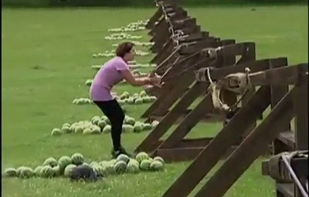 This is a clip from The Amazing Race on CBS, as you can see the girl got owned by a watermelon she was supposed to be throwing at some armors.