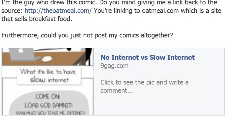 Many “angry” 9gag users started complaining to TheOatmeal on their facebook page, most of them repeating the same story that “without 9gag they would have never found out about the site, 9gag gives TheOatmeal ‘free publicity,'” and that” 9gag is just an ‘image sharing site’ and he should shut up because that’s how the internet works.” This kind of thinking is simply wrong on so many levels.