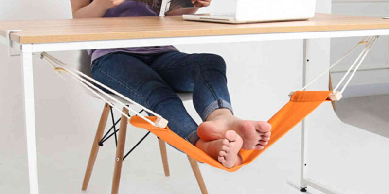 The Füüt Hammock is a small hammock for your feet that hangs under your desk and raises or lowers to keep you comfortable while working or slacking. It’s made of a piece of canvas connected to a series of ropes and clips. All you need is a table, or a table-like desk.