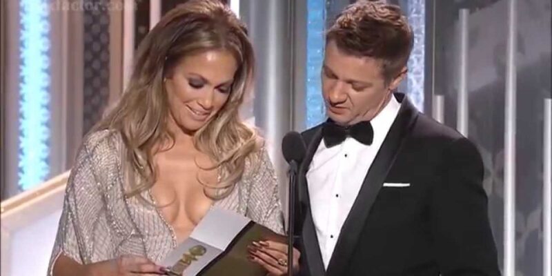 The award for best actor in a mini-series or motion picture made for television. Jeremy Renner goes all thug life on Jennifer Lopez. His stare has no regrets.